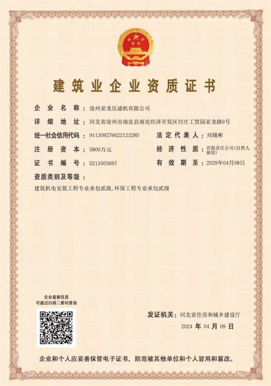 建筑業企業資質證書-滄州亞龍壓濾機有限公司