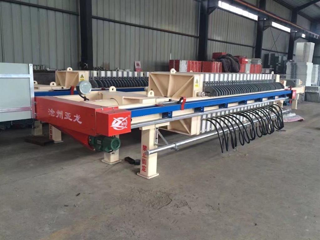 板框壓濾機有手動壓緊、機械壓緊和液壓壓緊三種形式。手動壓緊是螺旋千斤頂推動壓緊板壓緊;機械壓緊是電動機配H型減速箱,經機架傳動部件推動壓緊板壓緊;液壓壓緊是有液壓站經機架上的液壓缸部件推動壓緊板壓緊。兩橫梁把止推板和壓緊裝置連在一起構成機架,機架上壓緊板與壓緊裝置餃接,在止推板和壓緊板之間依次交替排列著濾板和濾框,濾板和濾框之間夾著過濾介質;壓緊裝置推動壓緊板,將所有濾板和濾框壓緊在機架中,達到額定壓緊力后,即可進行過濾。懸浮液從止推板上的進料孔進入各濾室(濾框與相鄰濾板構成濾室),固體顆粒被過濾介質截留在濾室內,濾液則透過介質,由出液孔排出機外。